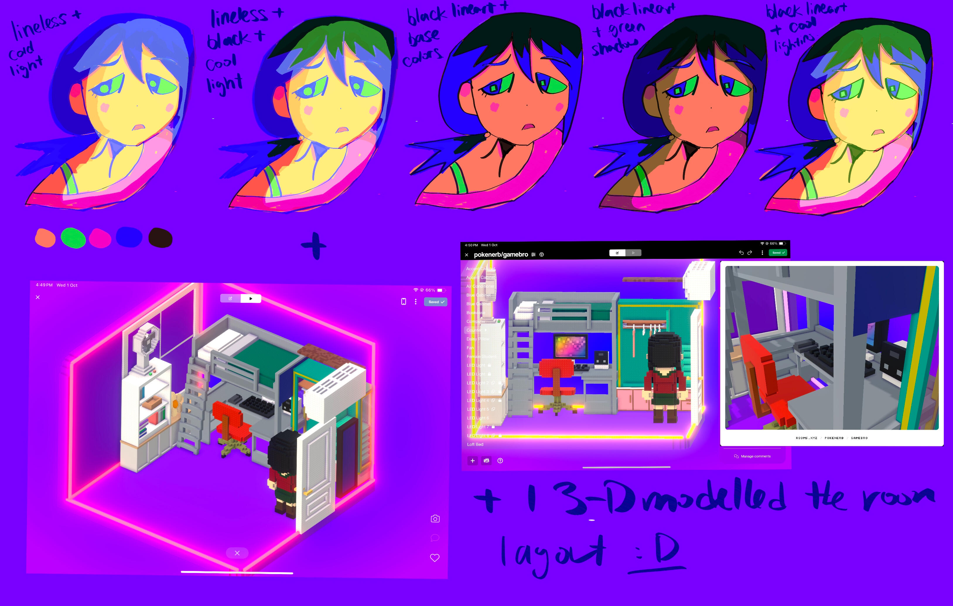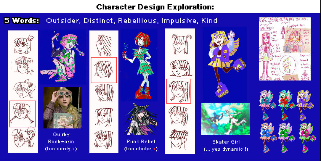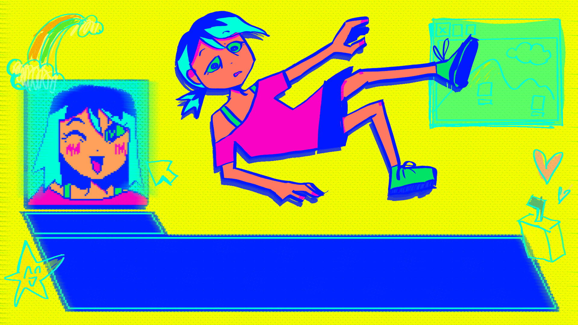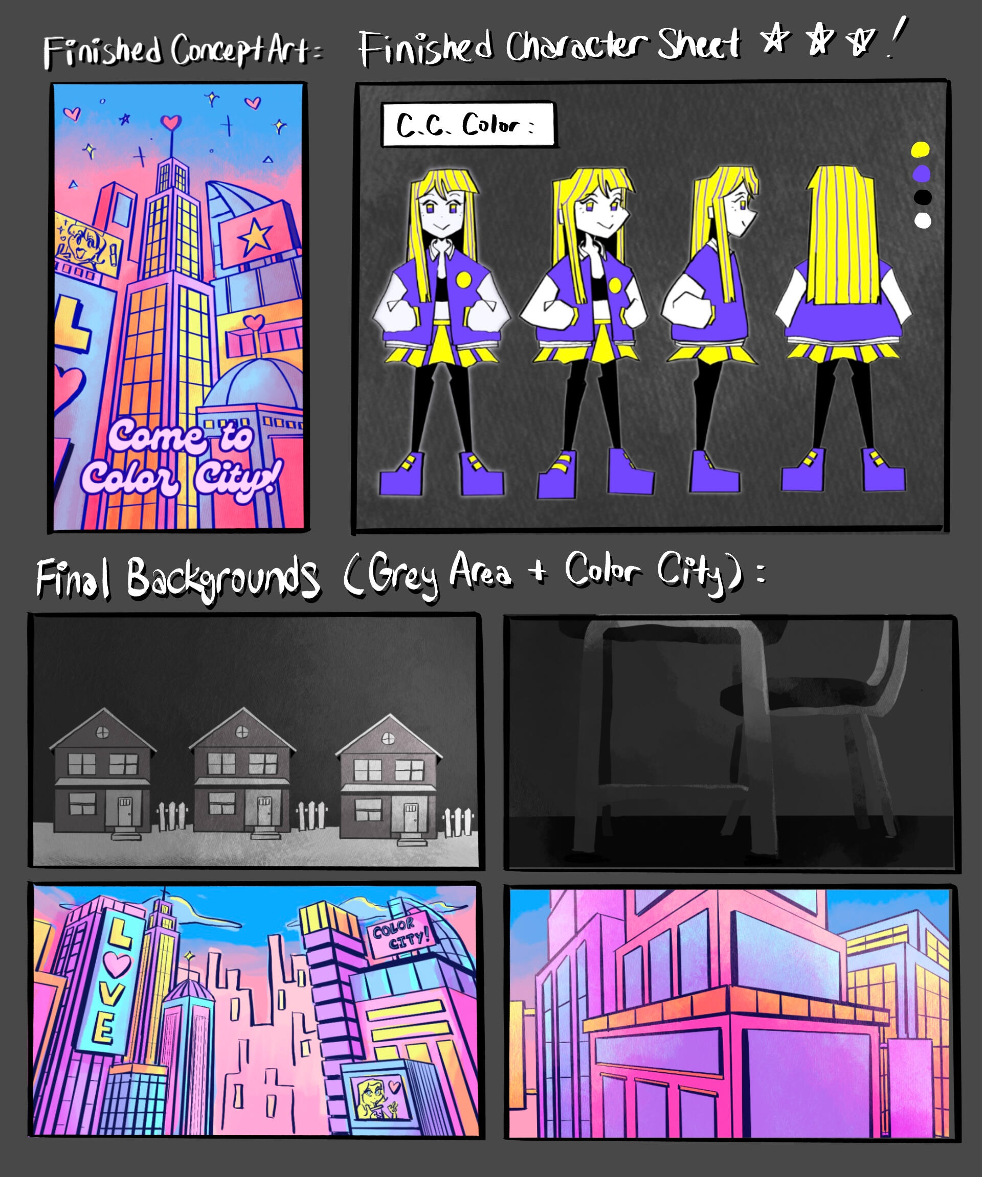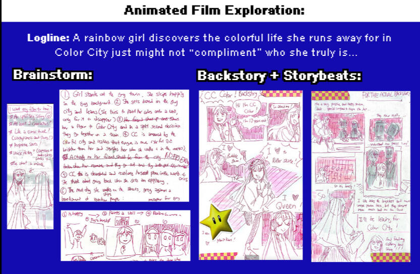C.C. Color is a colorful skater girl who originally was a video game character that I came up through a pun of the art term “Complementary Color”. I thought, wouldn’t it be funny if there’s a girl who blushes in different colors when you compliment her? Though I ended up adapting her as a rainbow outsider trying to fit in two different worlds for my film, Color City, I would love to revisit her character in a future project!C.C. Color also has her own blog! I created it using CSS to combine art with creative programming to "method act" as my character, and learned a lot about her in the process. You can say hi to her here: C.C.'s BlogC.C. Color 是一位色彩繽紛的滑板女孩,她最初是我根據藝術術語「互補色」的諧音梗創作的一個遊戲角色。我當時想,如果有個女孩在你誇獎她的時候臉會變成不同的顏色,會不會很搞笑?C.C. Color 也有自己的博客!我用 CSS 結合藝術和創意創建了這個博客,並在此過程中對她的喜好和角色有了更深刻的了解。你可以在這裡打個招呼:C.C. 的博客