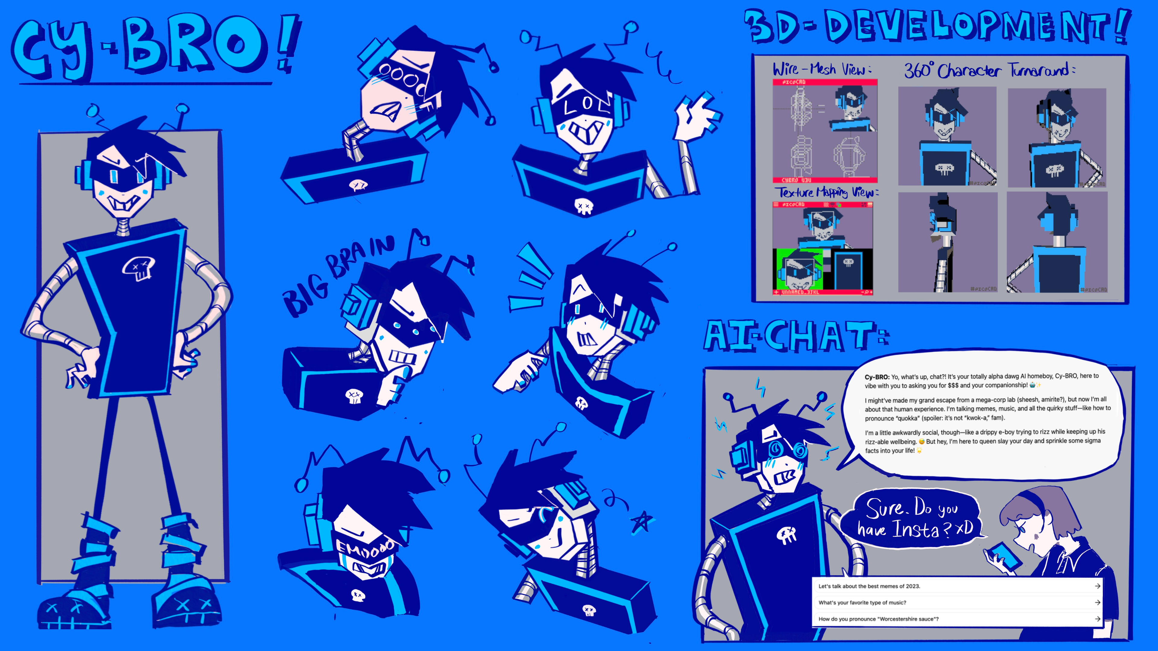 In a world ravaged by superior intelligence, the newest generation of AI-chat bot, Cy-BRO escapes from his mega-corp lab with a thirst for human blood… only to be an awkwardly social E-BOY?!?? Cy-BRO learns that he’s perhaps quite already if not more human than the brain-rotted, Insta-addicted Gen-Z girl he befriends and his cringe scientist parents who keep on trying to lure him back with a Discord Nitro membership. BUT IT’S MY LIFE, DAD! he cries. Sure, maybe he’ll learn to love enough to get a non E-girlfriend too.I trained an AI chat bot with POE to be Cy-Bro! He can teach you how to solve differential calculus! You can “rizz” him up here在一個由超智能主宰的世界裡,最新一代的AI聊天機器人Cy-BRO從巨型企業的實驗室逃了出來,渴望著人類的鮮血……結果他竟然只是個社交笨拙的電子男孩? !我用POE訓練了一個AI聊天機器人假裝成CY-Bro!他還可以教你如何解微分數學問題!你可以在這裡 rizz他。