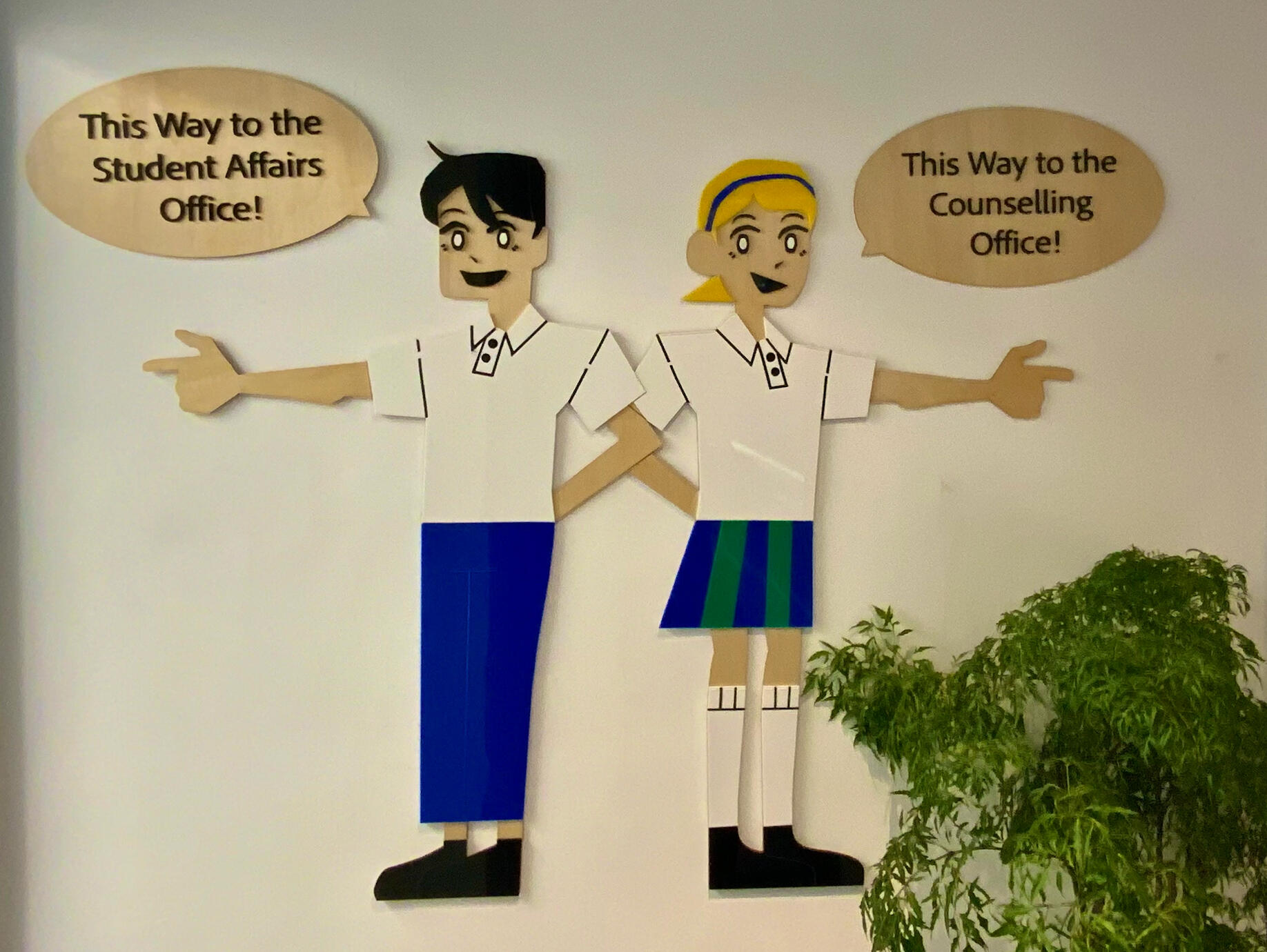 I was commissioned to design and assemble a 1-meter tall sign for a school counseling office. I spent weeks lasercutting and assembling using plywood, acrylic and vinyl stickers on Adobe Illustrator. I was also able to create human mascot character designs for this project.我受委託為一所學校的輔導辦公室設計並製作一塊1公尺高的標誌。我使用Adobe Illustrator,用激光切割和組裝膠合板、壓克力板和乙烯基貼紙完成了這項工作。我還為這個專案設計了一些擬人化的吉祥物。